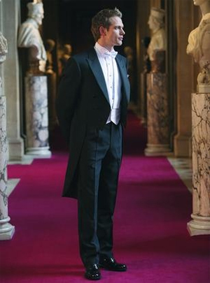 The tuxedo – also referred to as Black Tie and colloquially as a ‘monkey suit’ –was first introduced in America in the late 1800′s. At first seen as terribly casual and a bit risqué by the Europeans, by the 1930′s its adoption had become widespread; though for informal dinner parties only. A tuxedo is black or midnight blue and comprises a single-breasted, tailless jacket with matching trousers, white shirt and black bowtie. It’s appropriate for less formal, evening weddings.